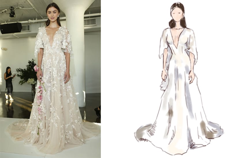 Закрытая зона плеча вовсе не означает, что свадебные образы стали полностью глухими и не оставили невестам шанса на то, чтобы быть соблазнительными. Спрятанные руки с лихвой компенсировало глубокое, очень глубокое декольте – буквально до талии или немногим выше. Вырез в форме латинской литеры V не только визуально удлиняет шею, но и сужает плечи, а также показывает в выгодном свете грудь любого размера. Конечно, модельеры не оставили нас один на один с природными данными и обеспечили надежную поддержку бюсту вшитыми чашками, поэтому за эстетику декольте можно не переживать.
