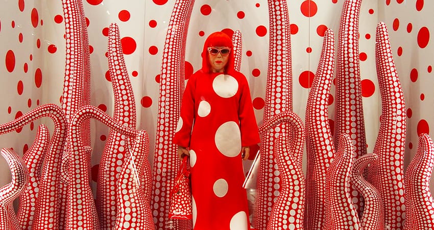 Японская художница впервые заинтересовала критиков и общественность еще в шестидесятых. Тогда она прославилась не только картинами, но и неоднозначными перфомансами, из-за которых ее даже причисляли к контркультуре. Например, основала собственную религию, в которой заняла вакансию «Верховной жрицы горошка». Или проводила акции с обнаженными моделями, тела которых были покрыты ярким горошком. При этом любила использовать необычную мебель со странными фаллическими отростками.