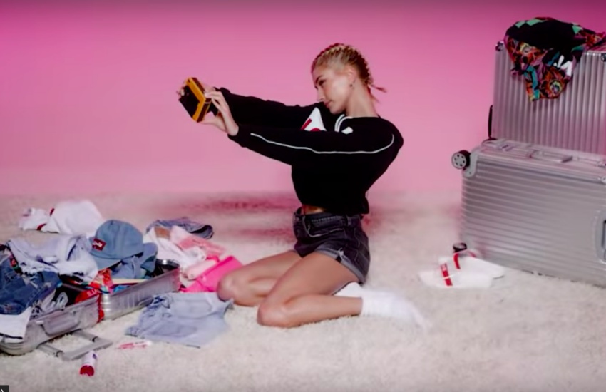 В рекламном видео к кампании Хейли Бибер упаковывает чемодан и рассказывает, что берет с собой на фестиваль (например, на Coachella-2019, который как раз стартует в эти выходные): солнцезащитный крем, бутылку воды, бальзам для губ, шорты, худи, кепка, джинсовая куртка, футболка, веер и фотоаппарат.