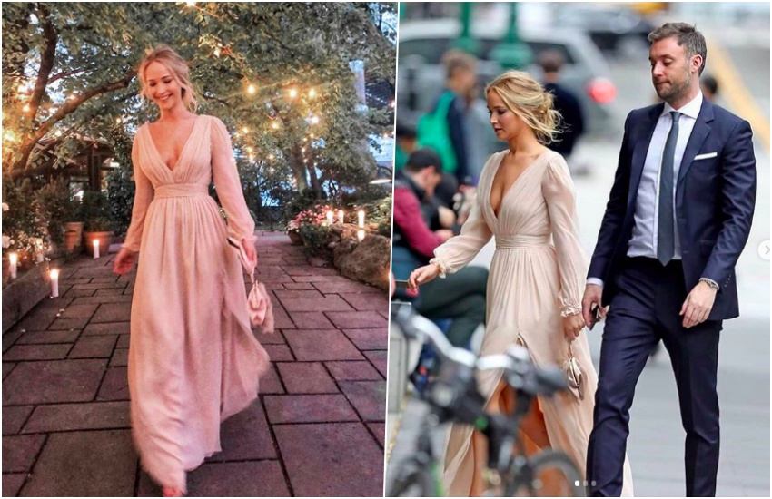 Предсвадебная вечеринка прошла в Нью-Йорке. Лоуренс выбрала для праздника нежное кремовое платье от L.Wells с разрезом и глубоким декольте, дополнив его легкой небрежной прической и едва заметным макияжем.