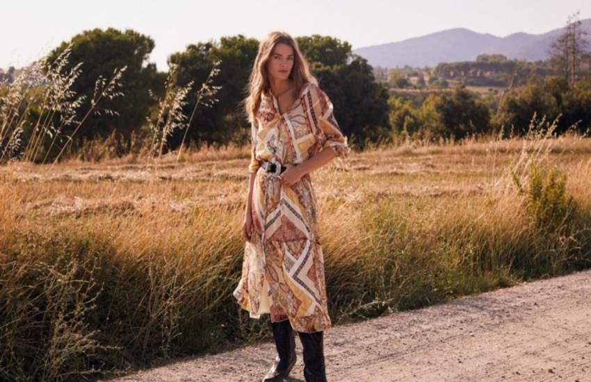 Платья с принтом «пейсли», джинсы-клеш, деним, натуральные цвета и грубая кожаная обувь — так Mango предлагает встречать осень.