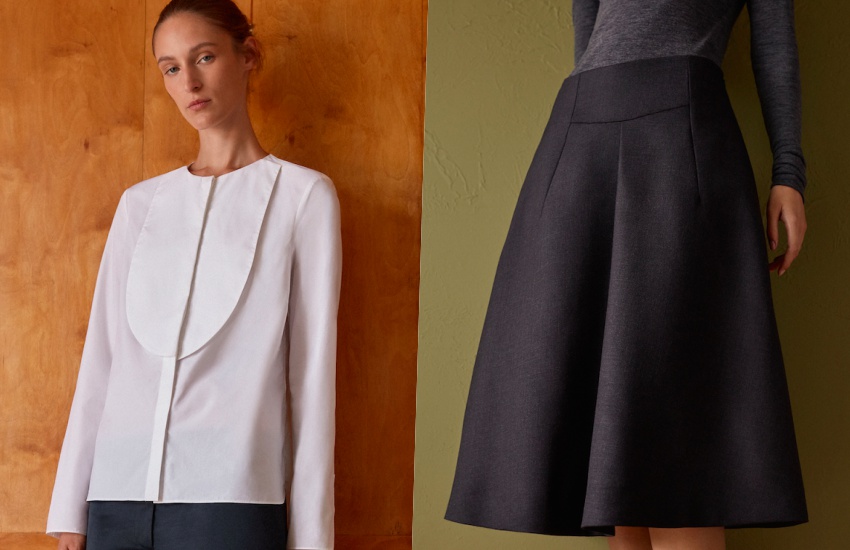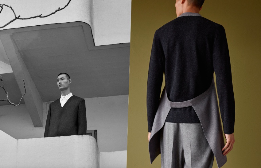 В коллекцию вошли пальто, пиджаки, рубашки, брюки, блуза, джемпер, платье, юбка, фартук и накидка. Рассматриваем лукбук!