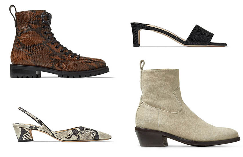 И это получилось: две модели ботинок (замшевые ковбойские и рокерские из змеиной кожи), босоножки на устойчивом каблуке и черные мюли одновременно практичны и шикарны.