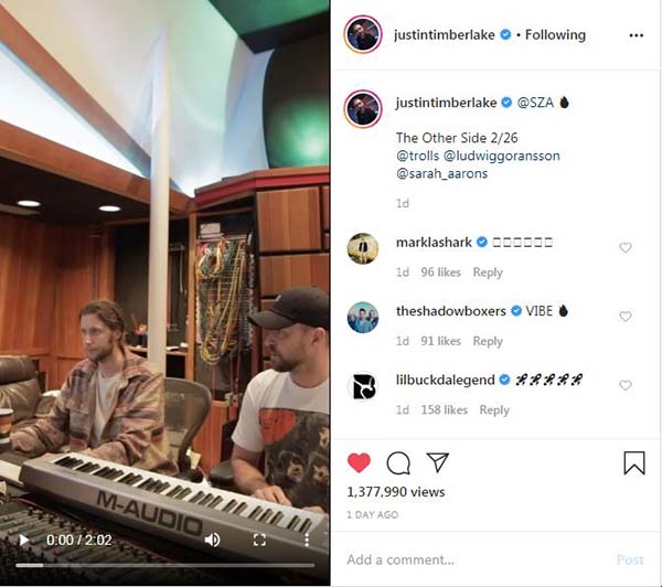 Джастин Тимберлейк и американская соул-певица SZA записали песню «The Other Side» – и тут же представил клип на нее. Ритмичная композиция войдет в сборник саундтреков к мультфильму «Тролли. Мировой тур», в котором Тимберлейк озвучил одну из главных ролей.