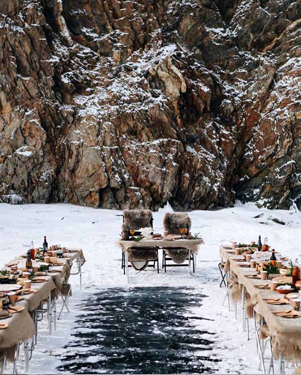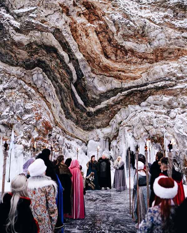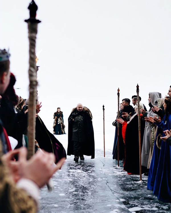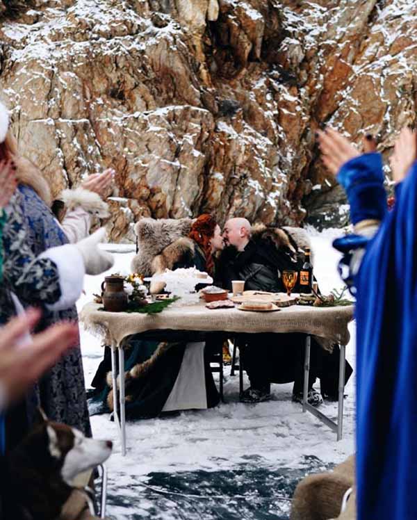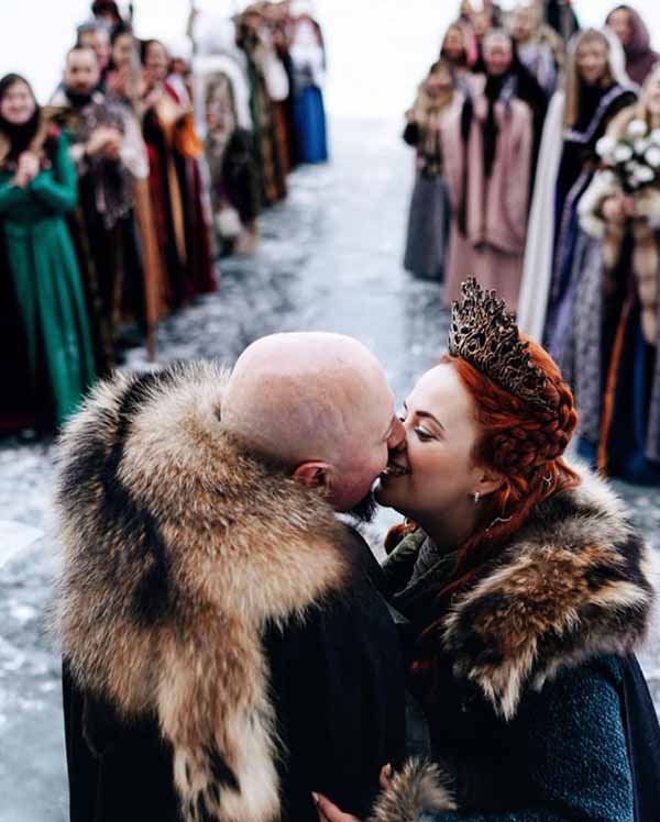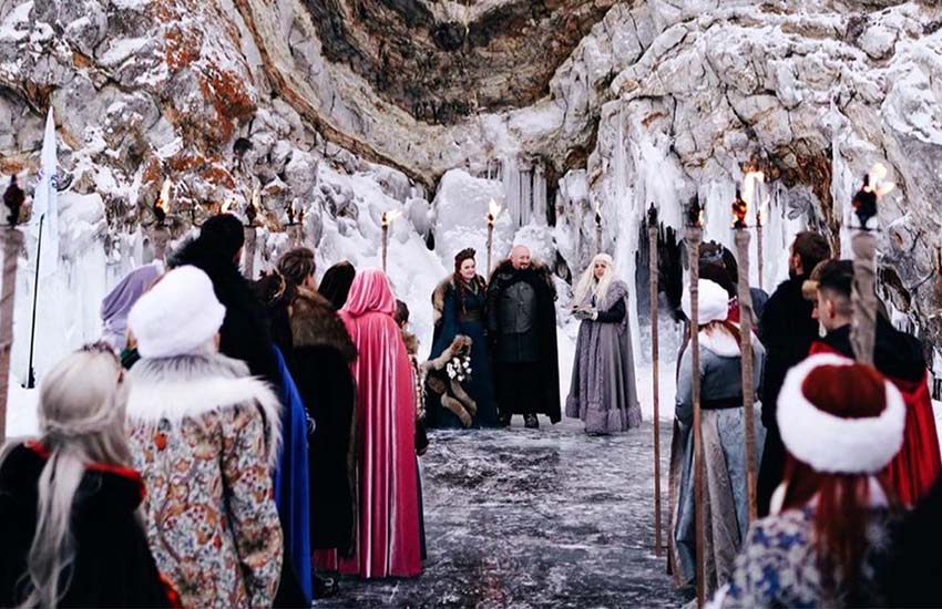 Москвичи Станислав Васильев и Дарья Булавина по случаю годовщины свадьбы провели необычную церемонию в стиле «Игры престолов». Пара обменялась клятвами прямо на льду озера Байкал.