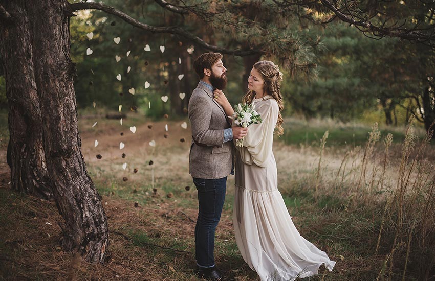 Что касается наряда жениха, то он вполне может быть цветным: синим, зеленым или коричневым – важно, чтобы он гармонировал с цветовой гаммой невесты. Либо же костюм может быть черным, а вот отдельные элементы (галстук или бабочка, подтяжки, жилет, шляпа) – актуальных природных оттенков.