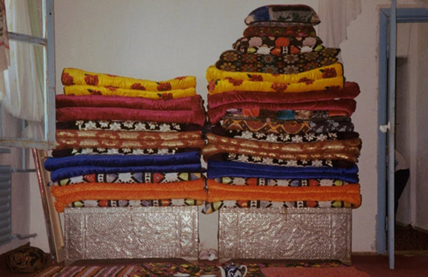 Контраст между многовековыми традициями мусульманской страны и влиянием западных тенденций поражает. Утром в день свадьбы невеста Мачлие отправилась в салон красоты, чтобы сделать макияж «как у Ким Кардашьян». А гости в это время ели традиционный плов и изучали приданое, состоящее из разноцветных мягких матрасов – курпачи, сложенных стопкой. Чем выше стопка в приданом, тем богаче семья. По обычаю жених приберег порцию плова для невесты, чтобы в семье был достаток.