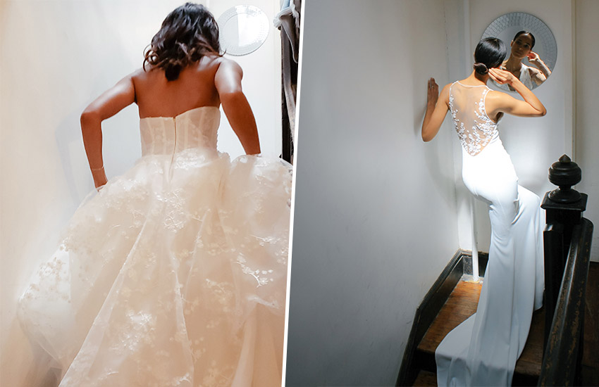 Из-за пандемии авторами съемки стали настоящие супружеские пары: модель Анжелу Хайсмит в нарядах линейки Nouvelle Amsale запечатлел ее новоиспеченный супруг Азио, а бродвейскую звезду Лауру Оснес в более минималистичных платьях Little White Dress – муж Натан, с которым они вместе уже почти 14 лет.