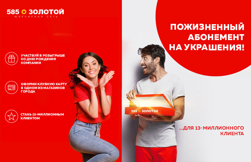 Для того, чтобы поучаствовать в розыгрыше, достаточно прийти в любой магазин «585*ЗОЛОТОЙ» и оформить клубную карту. На сегодняшний день в программе лояльности зарегистрировано 12 940 000 человек. Счастливчику, который станет 13-миллионным клиентом, и достанется уникальный приз – абонемент, по которому каждый год 13 августа он будет получать 10 000 рублей на покупку ювелирных изделий в нашей сети.