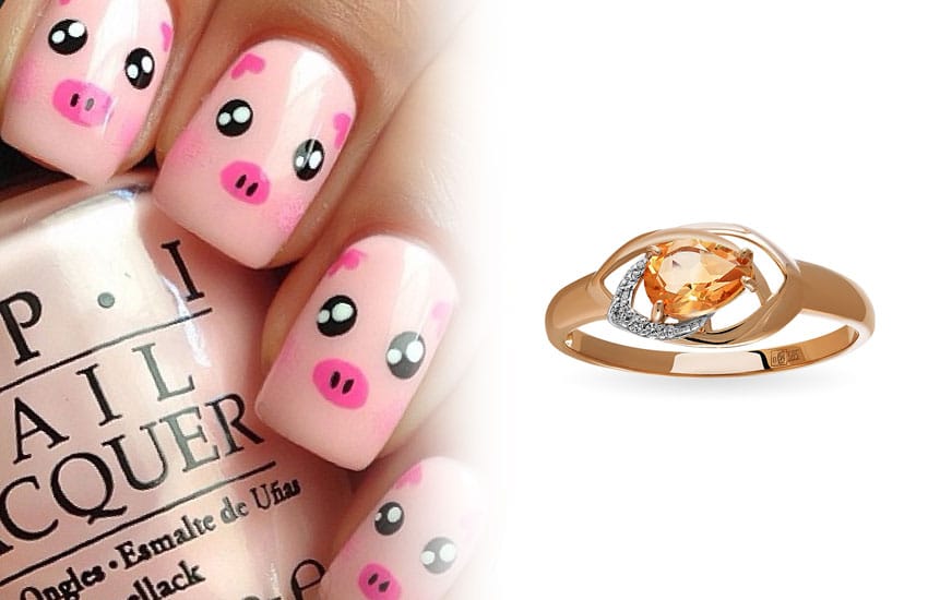 Для домашнего нейл-арт понадобится минимальный набор лаков – розовый, молочно-белый (или бежевый) и черный. На покрытую розовым лаком ногтевую пластину нужно нанести рисунок мордочки, ушек и пятачка свинки белым лаком, а затем нарисовать глаза черным лаком. Чтобы точки получились аккуратными, советуем воспользоваться доттером. Такие интересные ноготки отлично дополнит кольцо в цветовой гамме наступающего года – золото и жизнерадостный желты цитрин.