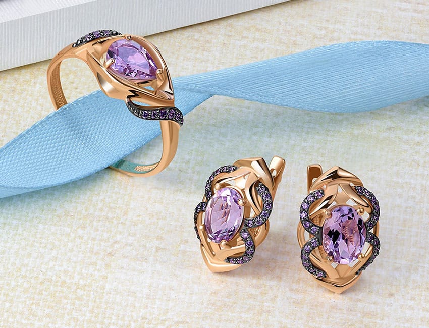 Чем дополнить: цвета макияжа отлично гармонируют с украшениями из золота с аметистами – такой образ особенно подойдет обладательницам карих глаз.