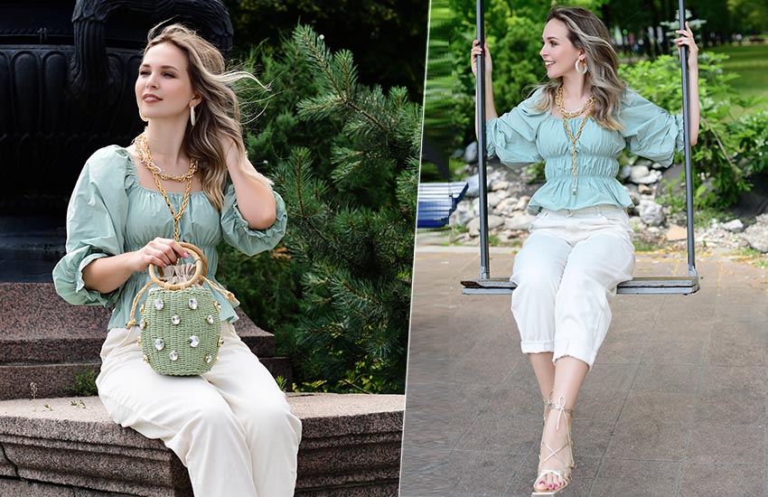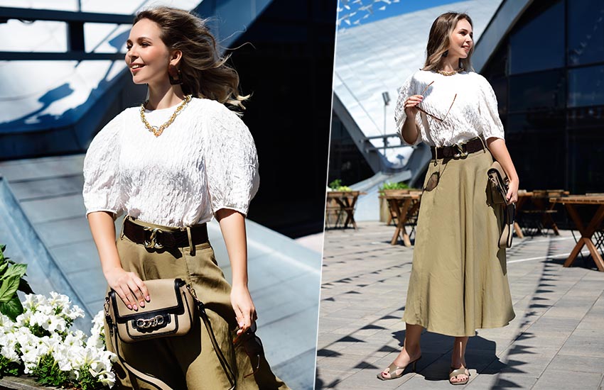 Настоящий street style комплект в стиле городского сафари может выглядеть очень женственно, благодаря деталям. Блуза с объемным рукавами заигрывает с округлыми линиями во внешности модели, а юбка-трапеция классического цвета хаки делает комплект универсальным для лета в городе. Красивый контраст с базовым молочным и цветом лаврового листа составят нюансы глубоких янтарных оттенков в кристаллах на длинных серьгах.