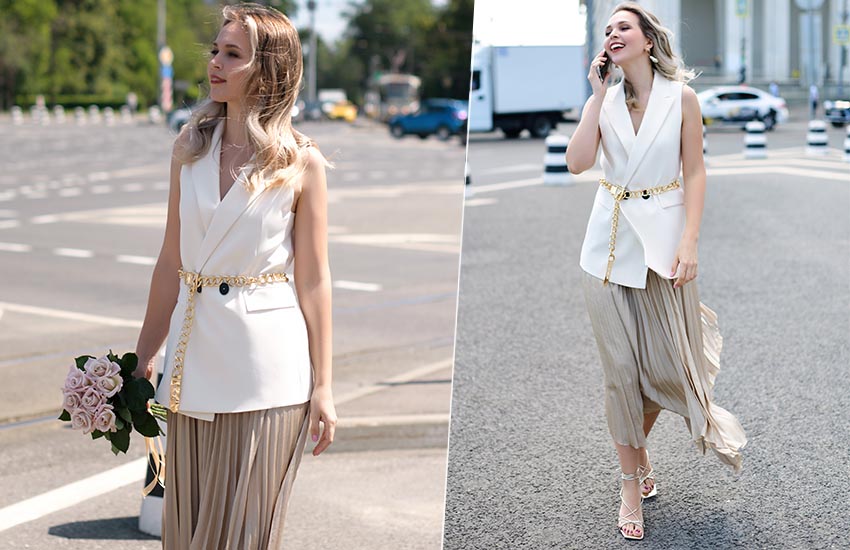 Кто-то из прохожих во время фотосессии даже принимал Катю за современную невесту в изящных золотистых босоножках и жилете цвета айвори. Модные ноты добавили юбка-плиссе с асимметричным краем и пояс-цепь. Поскольку в этом комплекте руки полностью открыты, их можно дополнительно украсить браслетами, особенно хороши будут браслеты-цепочки.