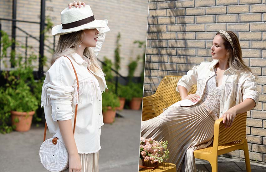 Небрежно накинутая поверх кружевного топа рубашка с бахромой, которая с легкостью заменяет куртку, шляпа из белой соломки, которую при желании можно заменить на джутовый ободок с ракушками – весь образ наполнен романтикой и свободой. Эффектной деталью станут серьги в форме перьев – изящный намек на индейские мотивы.