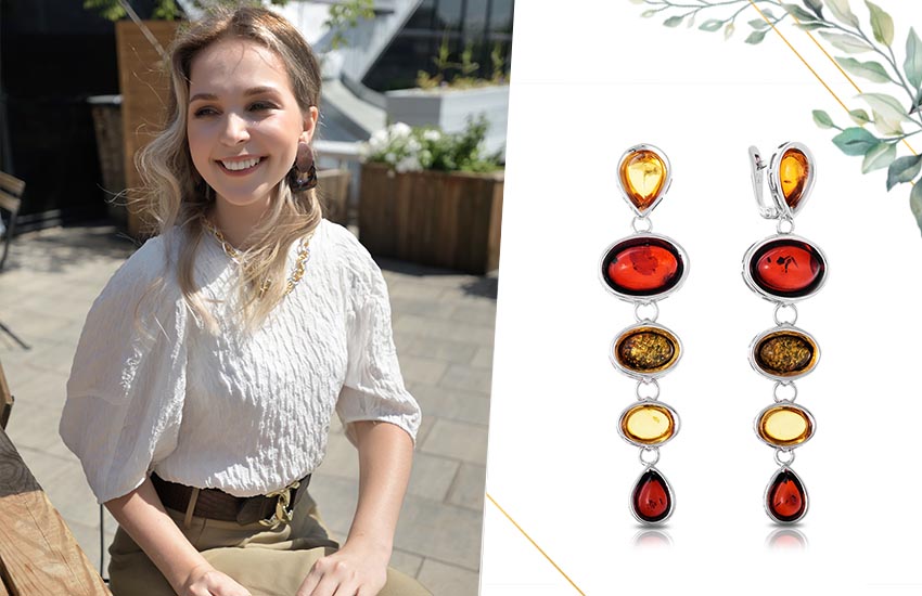 Настоящий street style комплект в стиле городского сафари может выглядеть очень женственно, благодаря деталям. Блуза с объемным рукавами заигрывает с округлыми линиями во внешности модели, а юбка-трапеция классического цвета хаки делает комплект универсальным для лета в городе. Красивый контраст с базовым молочным и цветом лаврового листа составят нюансы глубоких янтарных оттенков в кристаллах на длинных серьгах.
