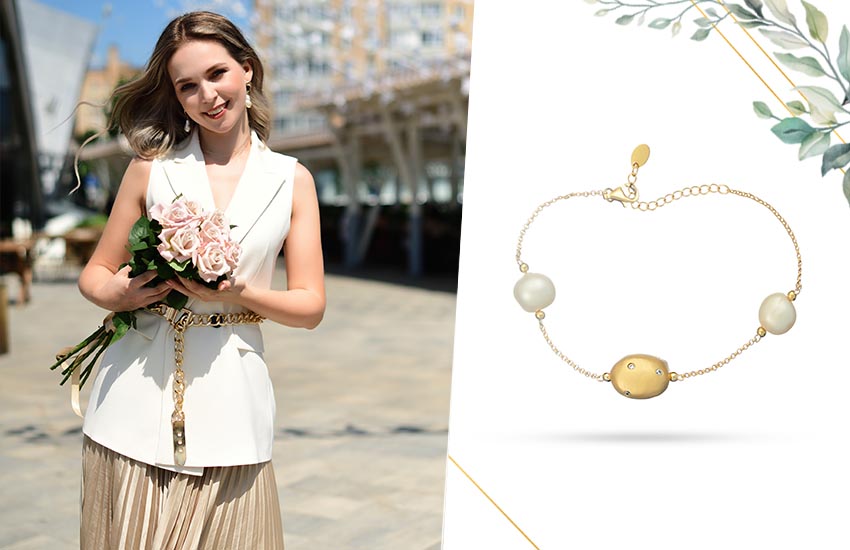 Кто-то из прохожих во время фотосессии даже принимал Катю за современную невесту в изящных золотистых босоножках и жилете цвета айвори. Модные ноты добавили юбка-плиссе с асимметричным краем и пояс-цепь. Поскольку в этом комплекте руки полностью открыты, их можно дополнительно украсить браслетами, особенно хороши будут браслеты-цепочки.