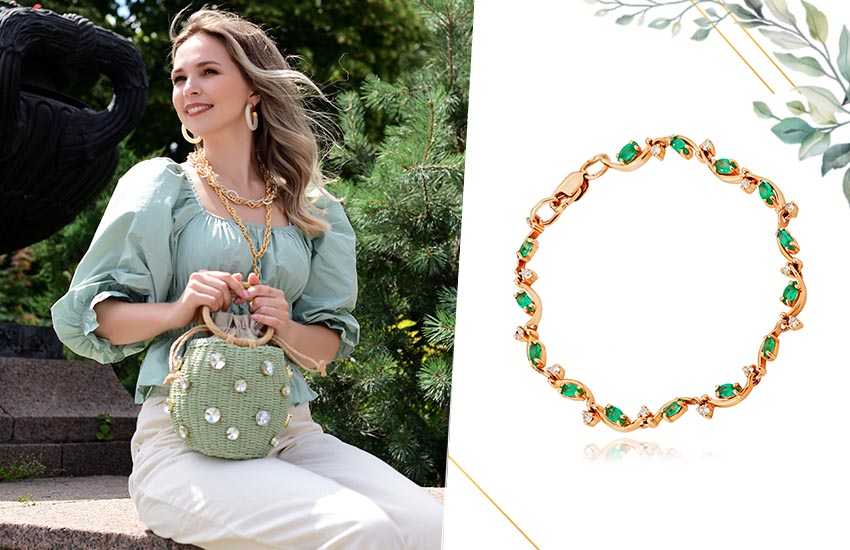 Ярусная блуза фисташкового оттенка выглядит очень нежно, но не в ущерб комфорту, благодаря удобным джинсам силуэта слоуч. Именно так сейчас и принято сочетать ультра-романтичные вещи – с модными практичными компаньонами. Ну, и, разумеется, принцесса должна носить драгоценности: золотой браслет с изумрудами и бриллиантами вторит и цветам, и самой идее образа.