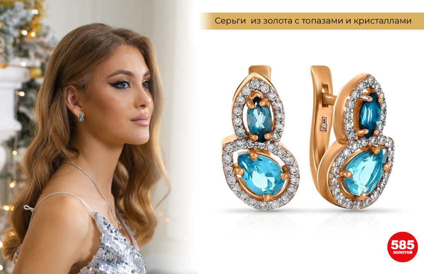 Небесный цвет камня подходит не только голубоглазым блондинкам и обладательницам серых глаз – на контрасте он тоже смотрится очень эффектно. Для большего блеска выбирай модели с топазами в окружении прозрачных камней.
