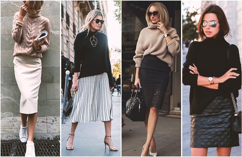 Ну, а что же сверху? Берем водолазку и заправляем ее в юбку или объемный свитер и заправляем его только с одной стороны – так мы подчеркнем талию и будем чувствовать себя комфортно.