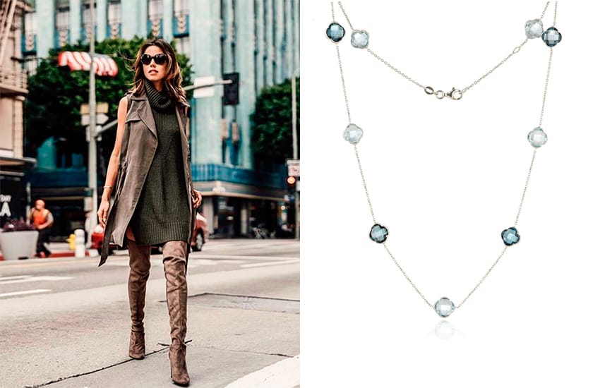 Если платье декольтировано, то шею стоит украсить колье или двумя-тремя цепочками, а сверху для тепла выберем модный шарф.