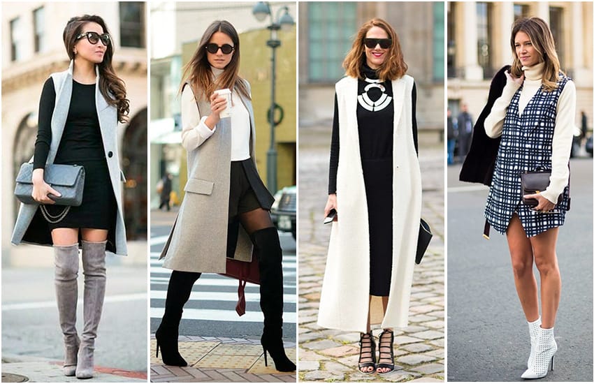 Еще поверх безрукавного платья можно надеть свитер, оставив напоказ только юбку. Если же платье с рукавом, то сверху надеваем жилет: удлиненный – к узким моделям, и короткий костюмный – к свободным платьям.