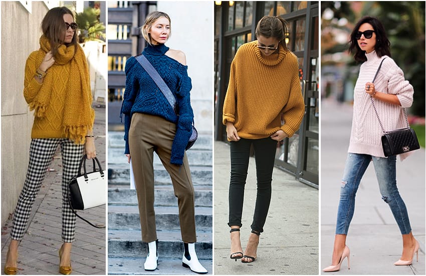 Ну, и самый простой, но оттого не менее красивый образ: брюки со свитером. Читаем внимательно: брюки средней или высокой посадки (не джинсы-скинни на бедрах!) со свитером (модным объемным свитером).