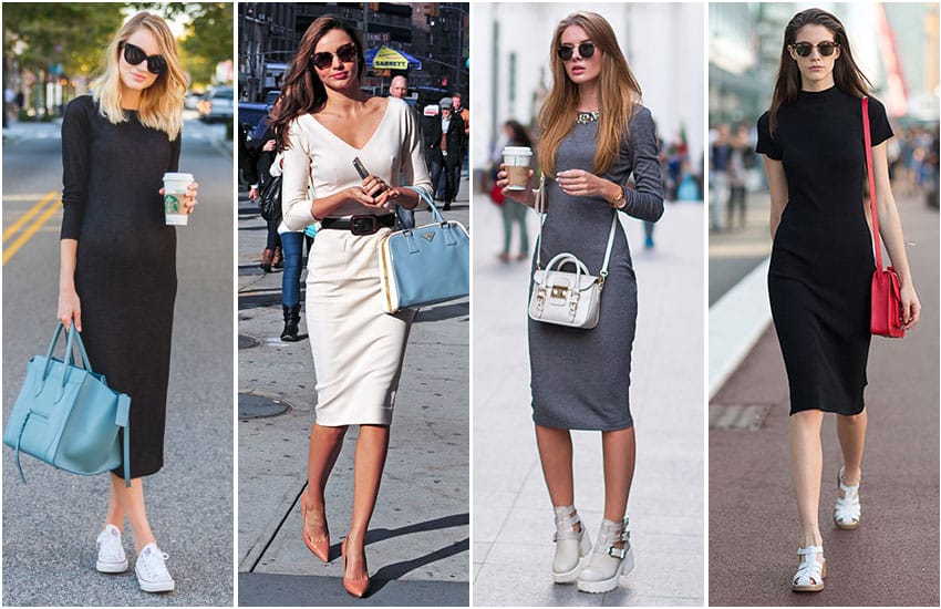 Платье прилегающего кроя как спутника надежного и серьезного давно прописали и в базовом гардеробе, и в классическом, и в деловом. А потом к нему посватались кроссовки и закрутили с футляром новый роман – искрящийся и юный.