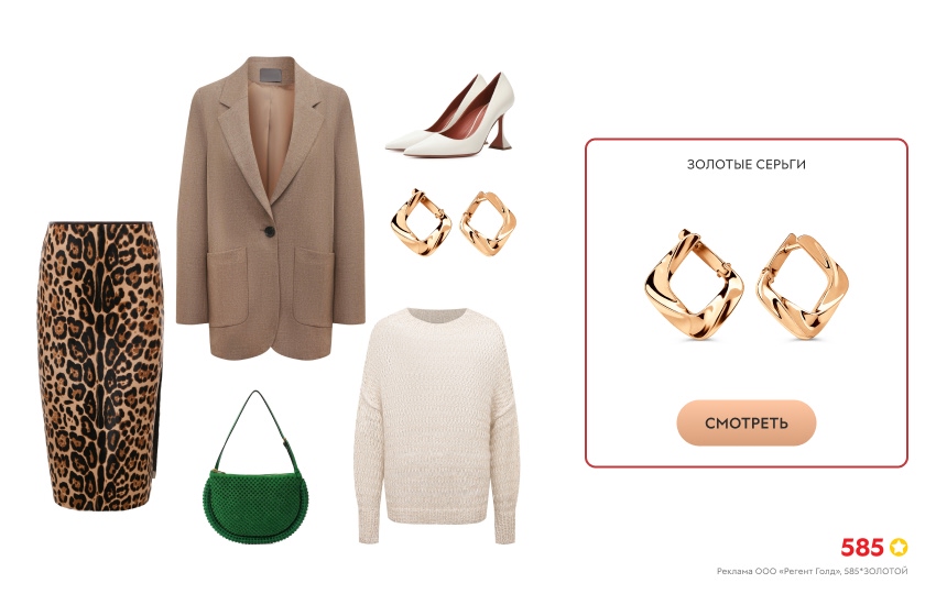 Соберем противоположный предыдущему комплекту образ Mob wife – жены мафиози. Под влиянием популярного сериала про мафию «Клан Сопрано» зародился стиль, где драматичные сочетание цветов и принтов дружат с нарочито сексуальными силуэтами. Подчеркиваем роскошную жизнь с помощью юбки-карандаша в анималистической расцветке, крупных золотых украшений и светлых лодочек на каблуке.
