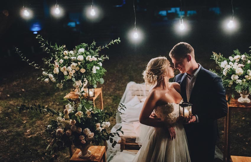 Все чаще молодожены склоняются к ночным церемониям: произносить клятвы на закате в свете свечей и фонариков особенно романтично.