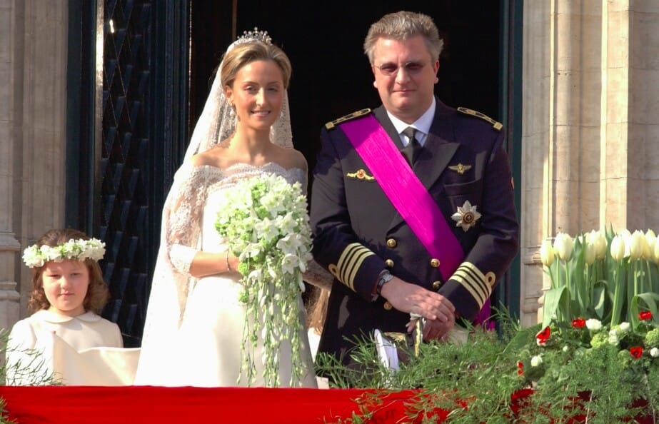 Украшение: на церемонию Клэр надела вуаль, принадлежавшую ранее ее свекрови, королеве Паоле. Удерживала вуаль тиара с бриллиантами – свадебный подарок родителей мужа.